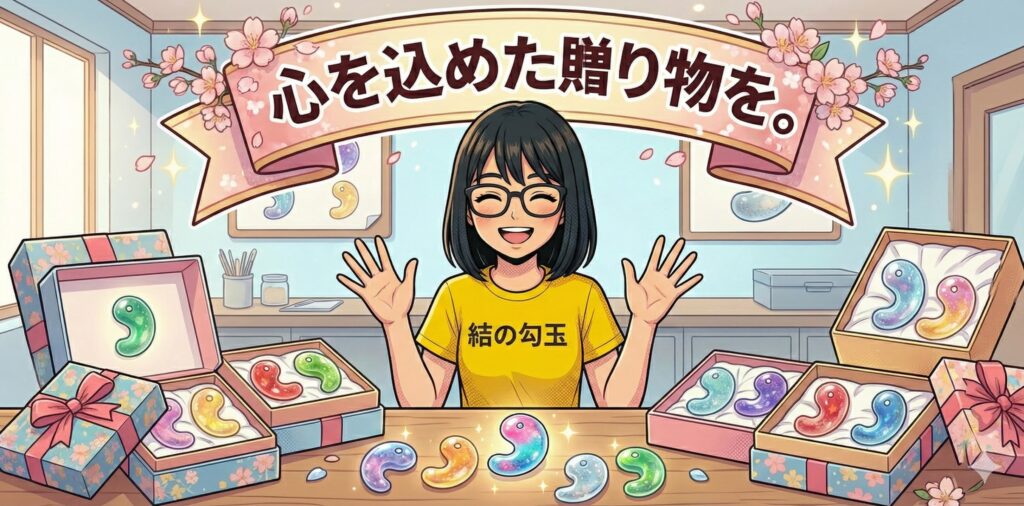 天然石にはない透明感、好きなものを封入できるカスタマイズ性、そして毎日身につけても疲れない軽さ。これらはすべて、贈る相手への「思いやり」を形にしたものです。相手の好きな色や花を閉じ込めた勾玉は、言葉以上にあなたの想いを伝えてくれるでしょう。