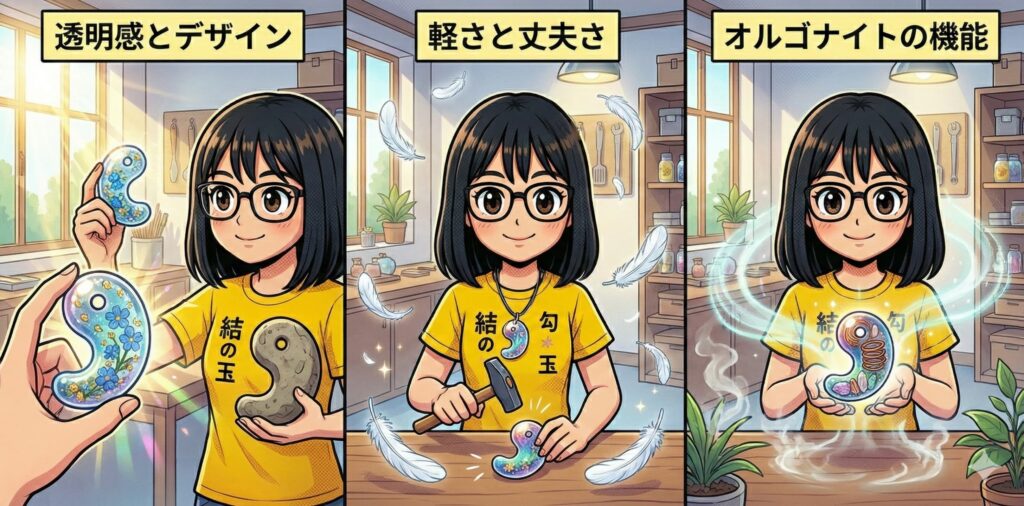 レジン勾玉の最大の強みは、その「自由度」にあります。第一に、天然石では不可能な色彩の表現が可能です。第二に、中にドライフラワーや金箔、文字などを封入できるため、ストーリー性を持たせやすい点。そして第三に、衝撃に強く割れにくいという耐久性です。天然石の勾玉は落とすと欠けてしまうことがありますが、高品質なレジン製であれば日常使いでも安心。美しさを長く保てるという点は、贈る側にとっても受け取る側にとっても大きな安心材料となります。